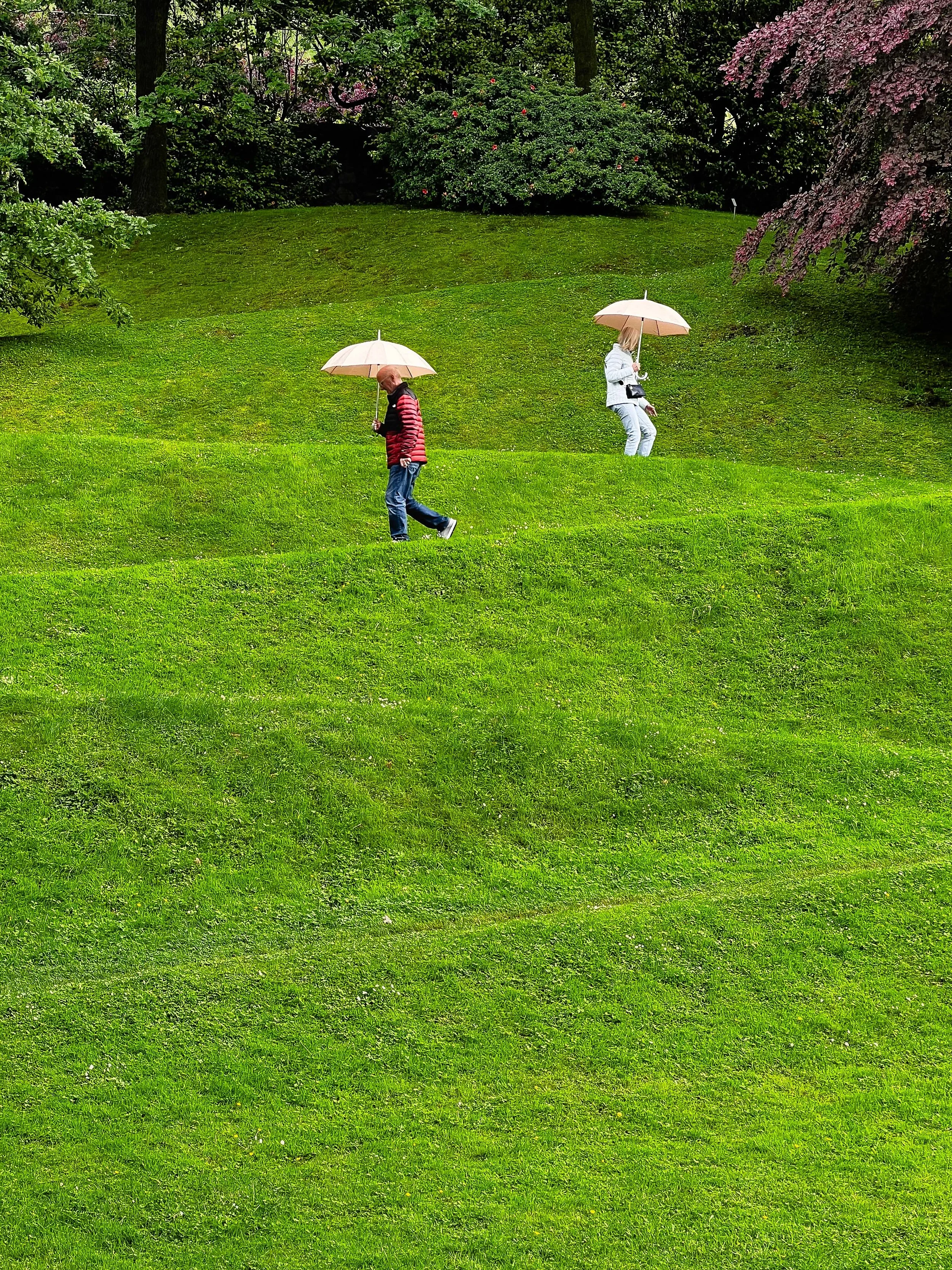 Italian couple with umbrellas walking down grassy switchbacks - Art Photography View fullsize